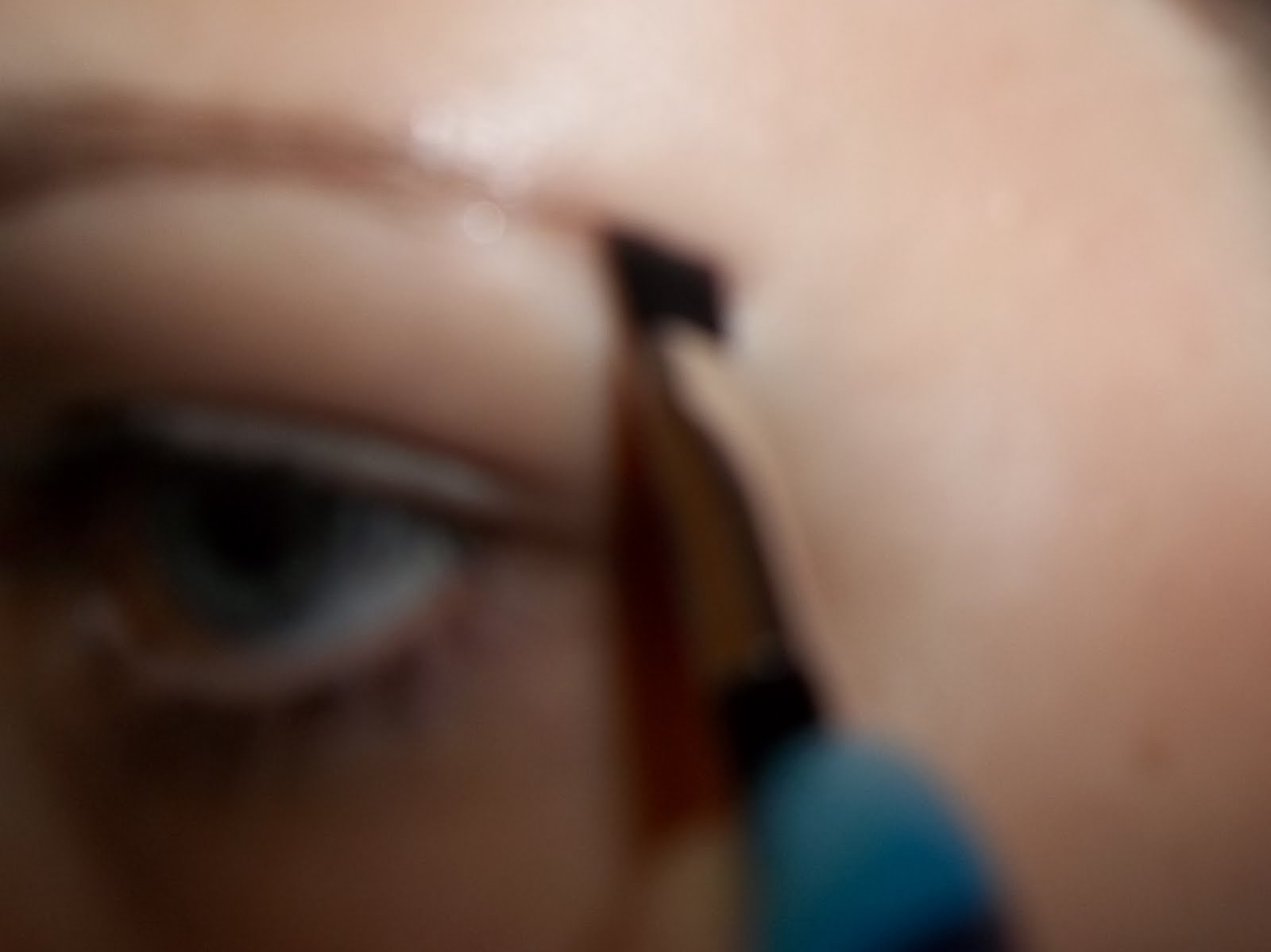 After applying the wax, coat the angled brush in the powders. use a mixture of the two shades to get a perfect match. I ended up using more of the darker shade. Brush onto the brows over the wax, keeping with the upward strokes. If you need to extend your tail, continue past the brow onto where you applied the wax, the wax will help the powders to adhere to you skin.